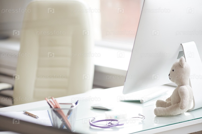 Рабочее место педиатра: стеклянный стол с современным компьютером, ручки в чашке, стетоскоп и игрушечный медведь