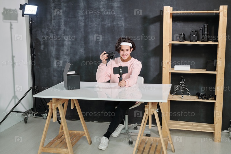 Мужчина-влогер сидит за столом и показывает камеру, стреляя в себя