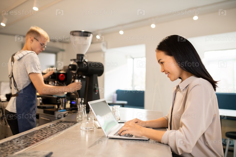Молодой клиент кафетерии серфирует в сети с баристами на заднем плане