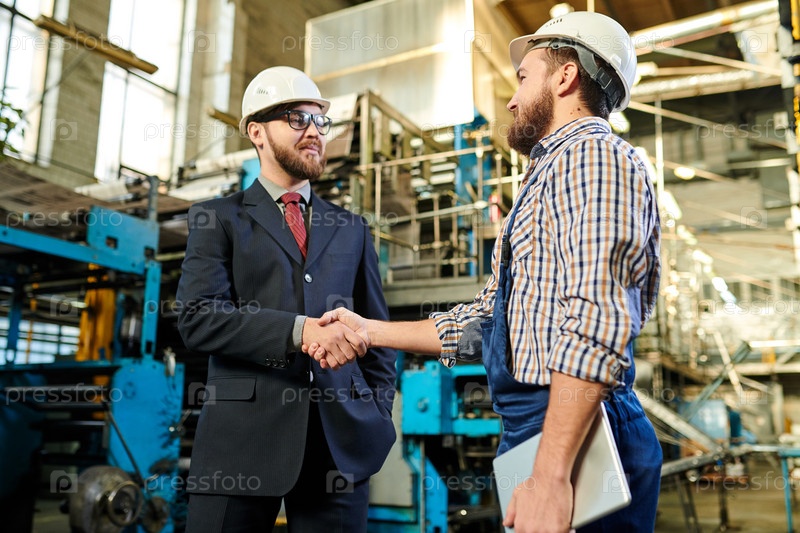 Контент молодой промышленный инженер с планшетом, который делает рукопожатие с новым инвестором после заключения сделки