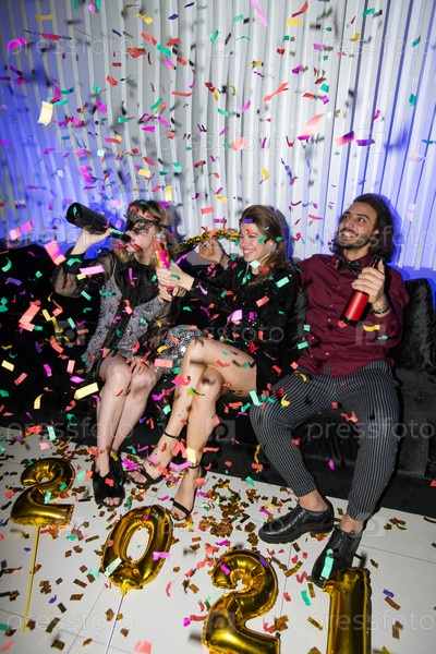 Группа счастливых молодых друзей пьют пиво, сидя на диване в ночном клубе