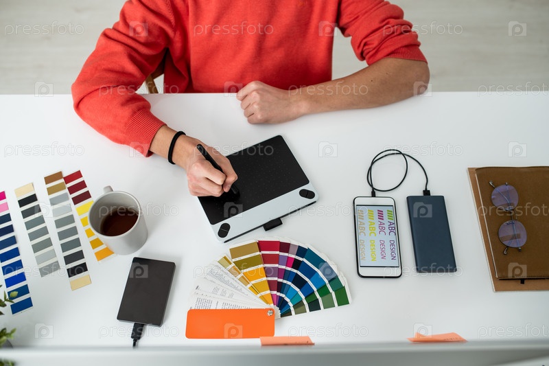 Руки молодого мужского веб-дизайнера со стилусом во время ретуширования работы на столе
