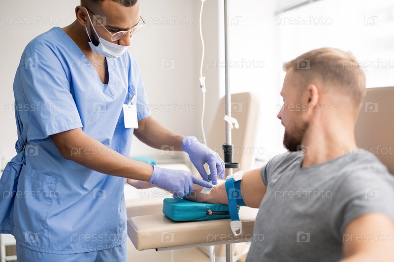 Современный врач готовит руку больного пациента для инъекции капельницей