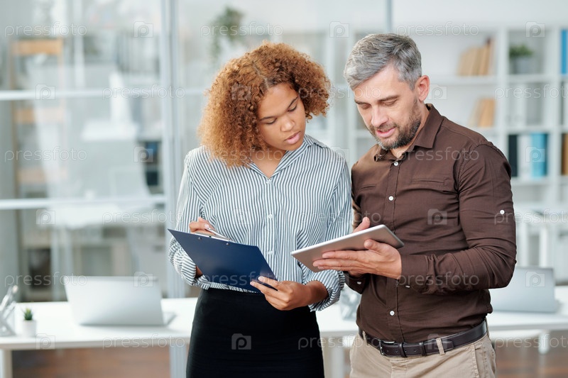 Два современных банкира проверяют финансовые данные на бумаге и в планшете