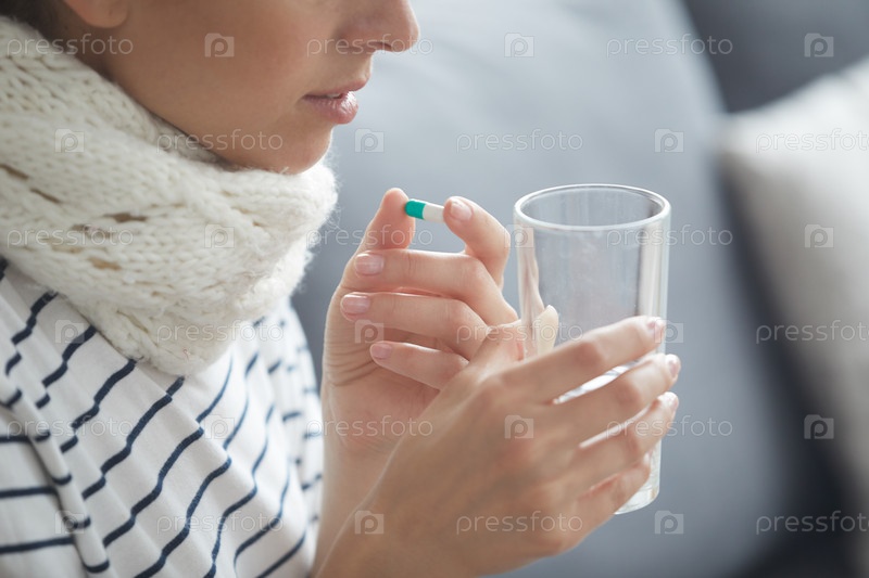 Больная женщина пьет воду с таблетками