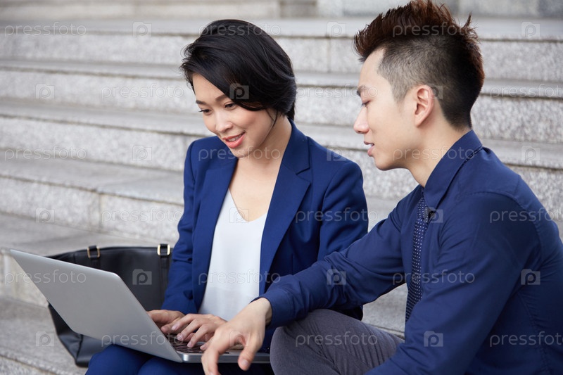 Бизнесмены сидят на улице с ноутбуком