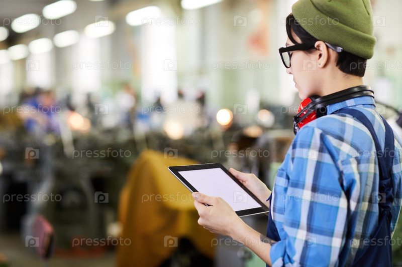 Серьезная занятая женщина-инженер в хипстерской шляпе и очках, стоящая в промышленном магазине и использующая планшет во время просмотра онлайн-записок