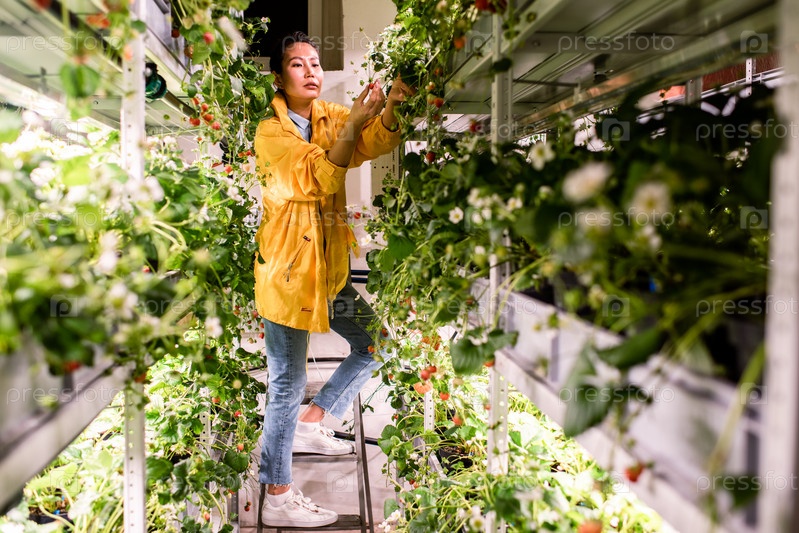 Молодая азиатская женщина в повседневной одежде собирает клубнику в огороде