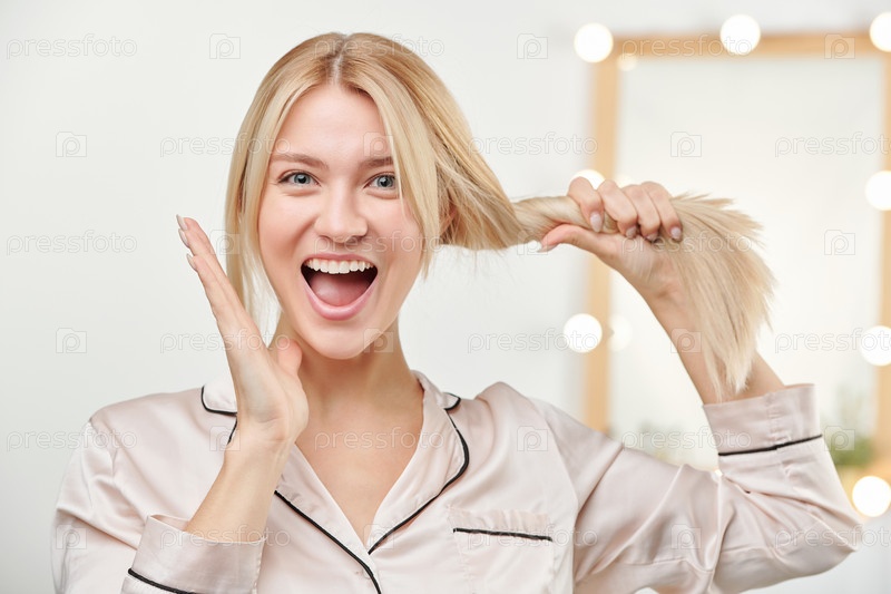 Взволнованная девушка в бежевой пижаме, хвастающаяся длинными толстыми блондинками здоровых волос