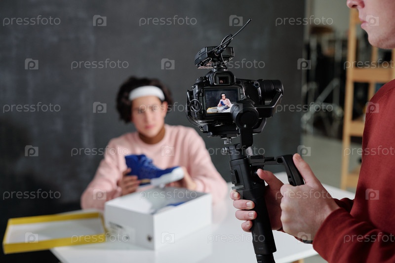 Молодой человек держит видеокамеру, стоя перед влоггером у стола