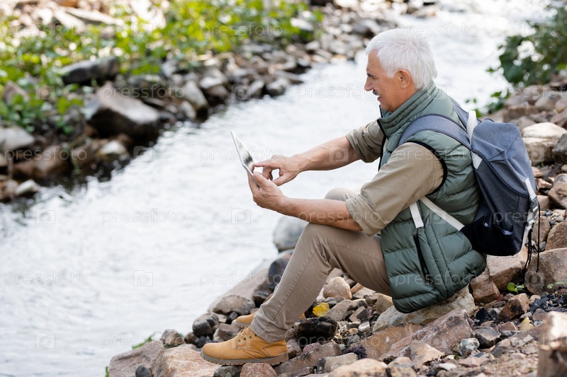 Пожилой мужчина в спортивной одежде показывает на дисплей с сенсорным панелем, сидя на берегу реки
