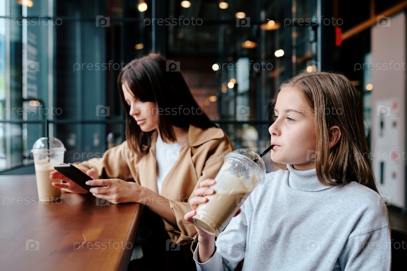 Серьезная девушка пьет молочный коктейль и смотрит в кафе через окно