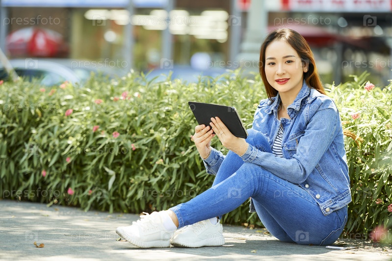 Красивая азиатская женщина с планшетным компьютером