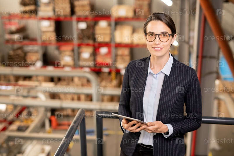 Довольно молодая самоуверенная бизнесвумен в формальной одежде, использующая цифровой планшет