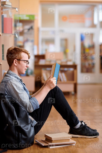 Молодой умный человек в повседневной одежде читает книгу в библиотеке после занятий