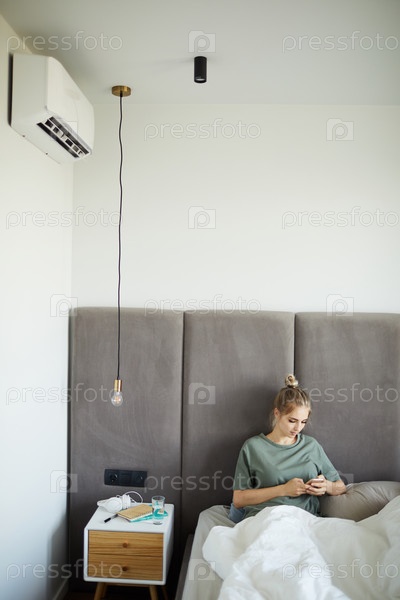 Красивая девушка в футболке отправляет сообщения своим друзьям в постели