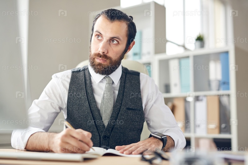 Серьезный, внимательный молодой бородатый адвокат в сером жилете и белой рубашке сидит за столом и делает записки на планшете, глядя на монитор компьютера
