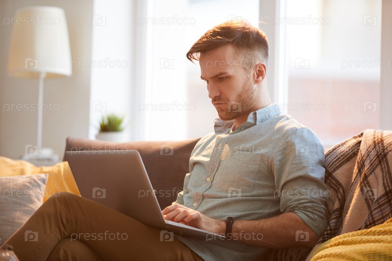 Красивый мужчина использует ноутбук дома
