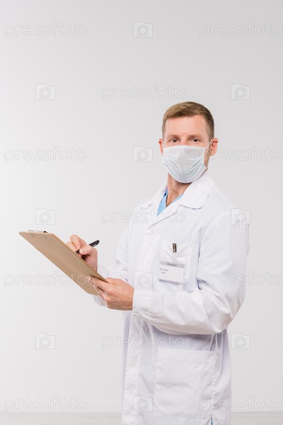 Молодой врач в белом халате и защитной маске делает рецепты для пациента