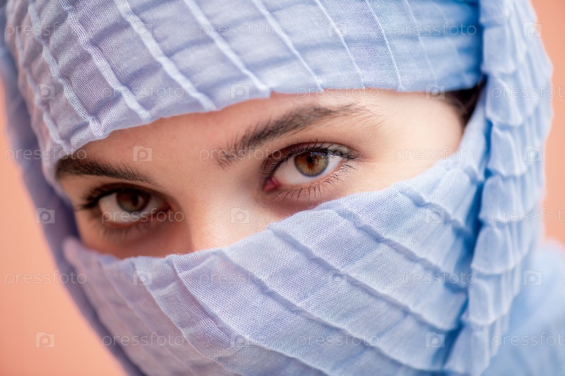 Взгляд молодой привлекательной мусульманки в синем хиджабе, которая смотрит на тебя