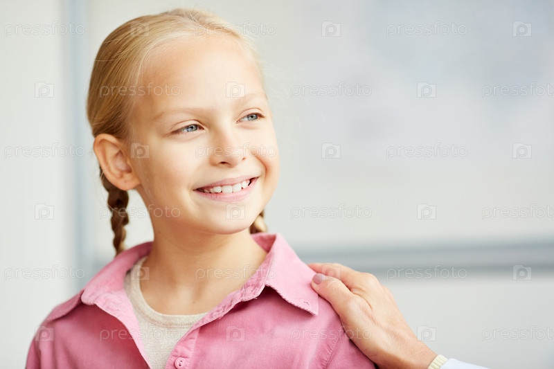 Непризнанная женщина прикасается к плечу улыбающейся красивой школьницы в розовой рубашке, поддерживая ее