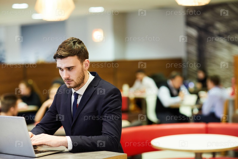 Серьезный, сконцентрированный молодой бизнесмен со стервями сидит в деловом кафе и печатает на ноутбуке, работая онлайн во время обеденного перерыва