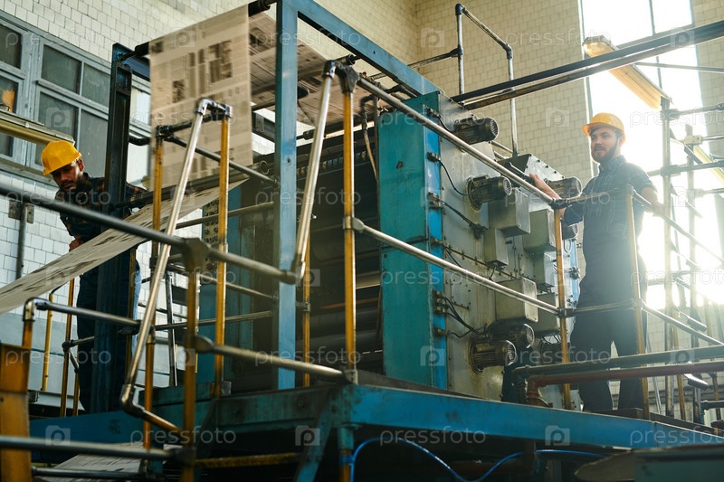 Загруженные молодые мультиэтнические производственные рабочие в жестких шляпах, стоящие у печатного станка и контролирующие процесс печатания газеты