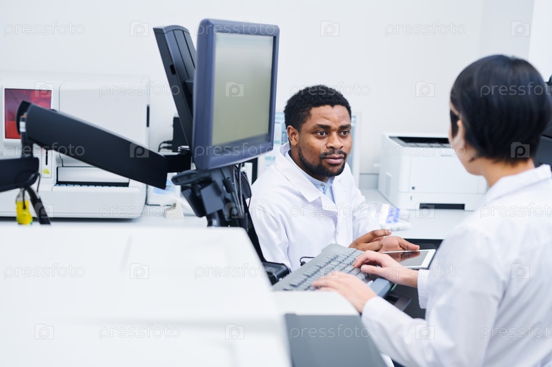 Лабораторные ученые обсуждают результаты медицинских тестов