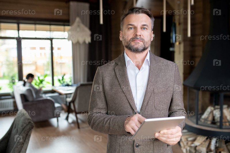 Серьезный бизнесмен средних лет с бородой, прокручивающийся по сенсорной панели в ресторане