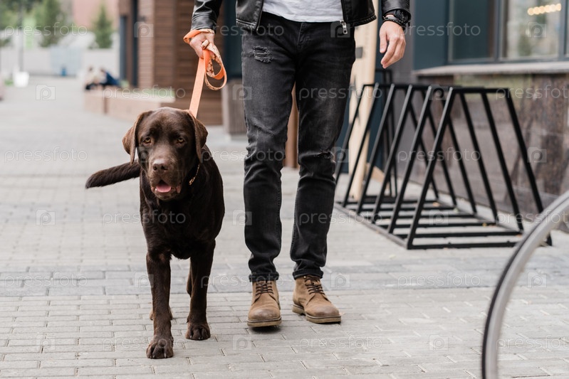 Милая коричневая чистокровная собака и ее хозяин переезжают по улице города