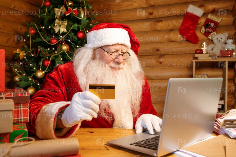 Перчатый Санта в костюме держит пластиковую карточку, делая онлайн-заказ
