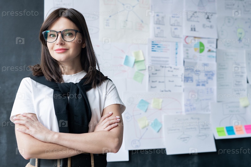 Красивая молодая бизнесвумен в очках, скрестившая руки за грудь