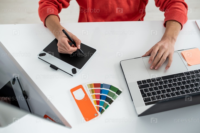 Руки молодого веб-дизайнера, держащего стилус над экраном графического планшета