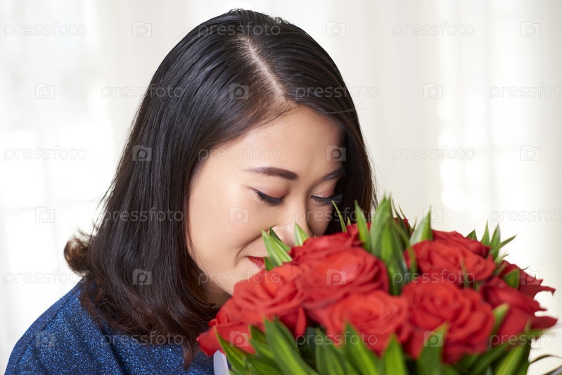Женщина с букетом красных роз