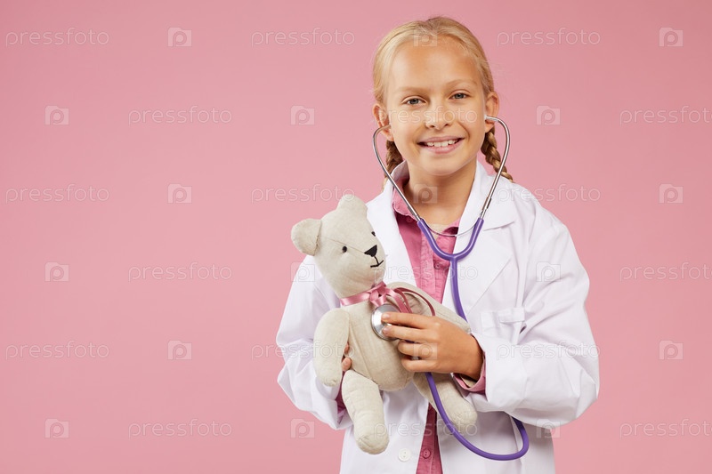 Портрет счастливой красивой маленькой девочки с блондинками, одетой в белое пальто и использующей стетоскоп во время осмотра игрушечного медведя