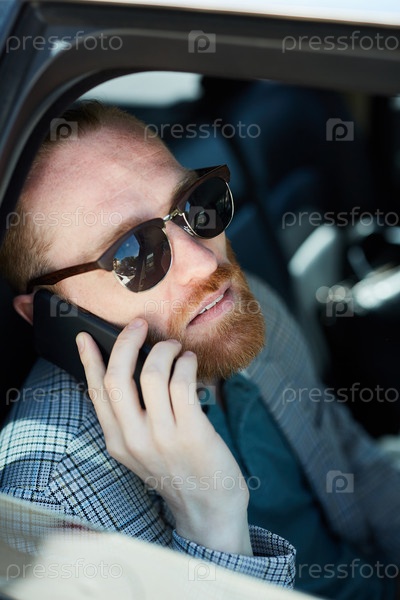 Бородатый бизнесмен разговаривает по телефону внутри машины