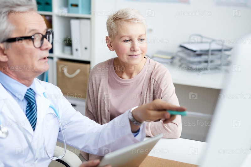 Серьезный старший врач-мужчина сидит за столом и указывает на монитор, объясняя компьютерную томографию пациенту