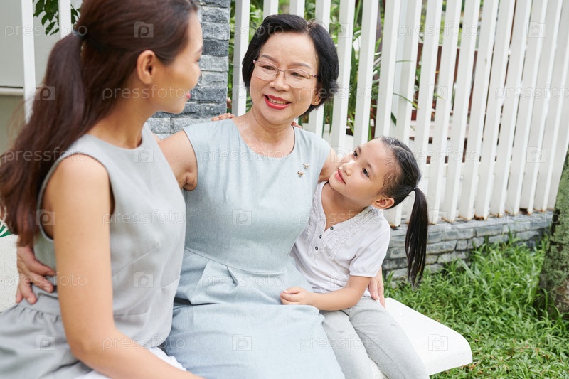 Красивая азиатская семья сидит на свежем воздухе