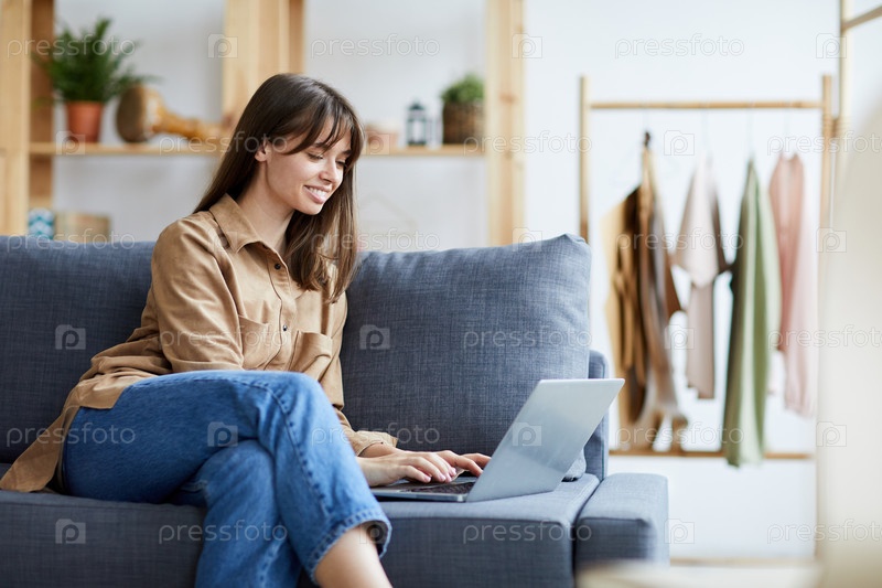 Улыбающаяся уверенная женщина-предприниматель в повседневной одежде сидит на диване и печатает на ноутбуке в собственном магазине одежды