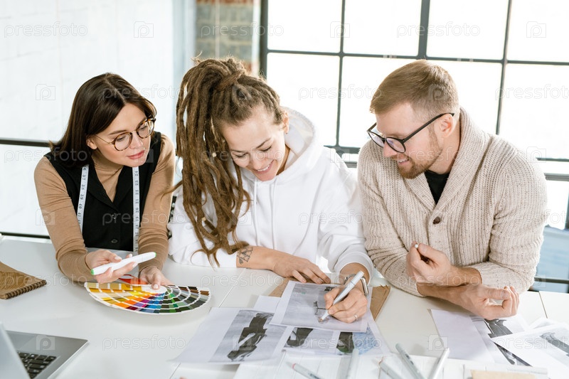 Группа молодых креативных дизайнеров одежды, работающих над новыми модными эскизами