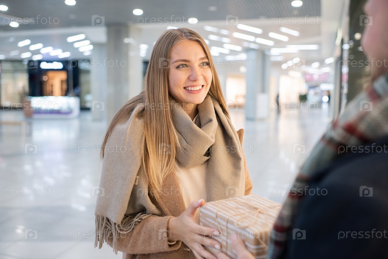 Молодая улыбающаяся женщина смотрит на своего мужа, забирая коробку с подарками