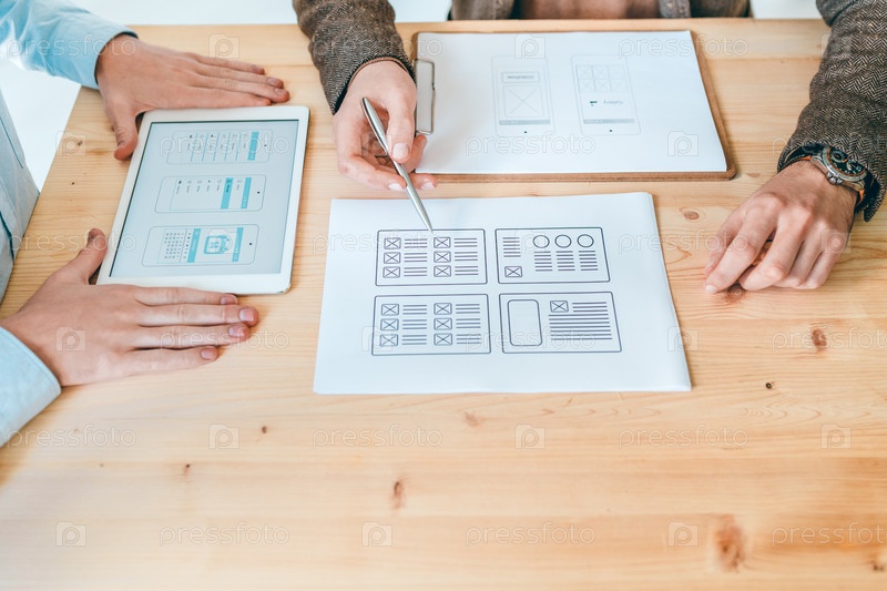 Руки двух молодых дизайнеров, обсуждающих макеты новых веб-сайтов