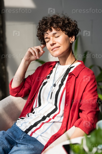 Молодая счастливая женщина в умном повседневном костюме сидит в кресле после работы