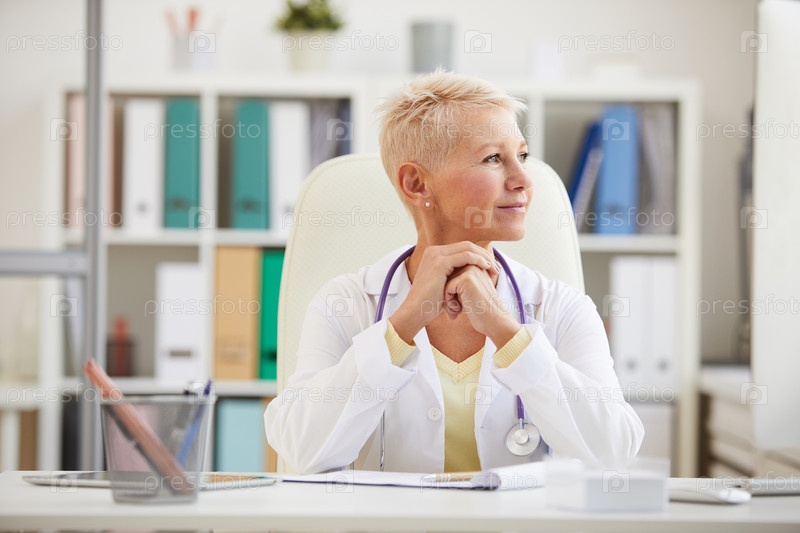 Вдумчивая привлекательная женщина-врач со стетоскопом на шее сидит за столом в офисе и отворачивается, ожидая пациента