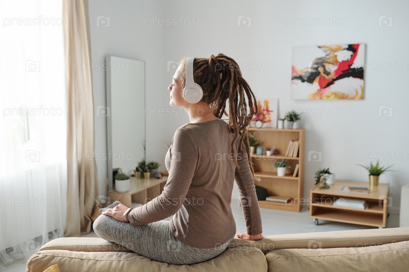 Красивая молодая случайная женщина с дредольками, наслаждающаяся медитационной музыкой