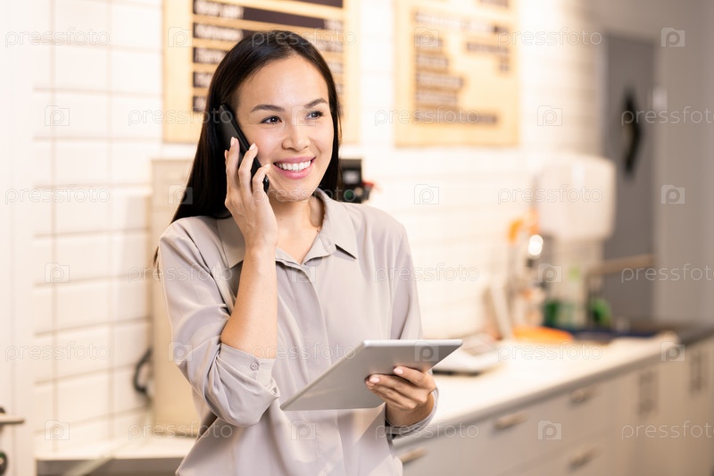 Молодой веселый менеджер ресторана общается с клиентом по мобильному телефону