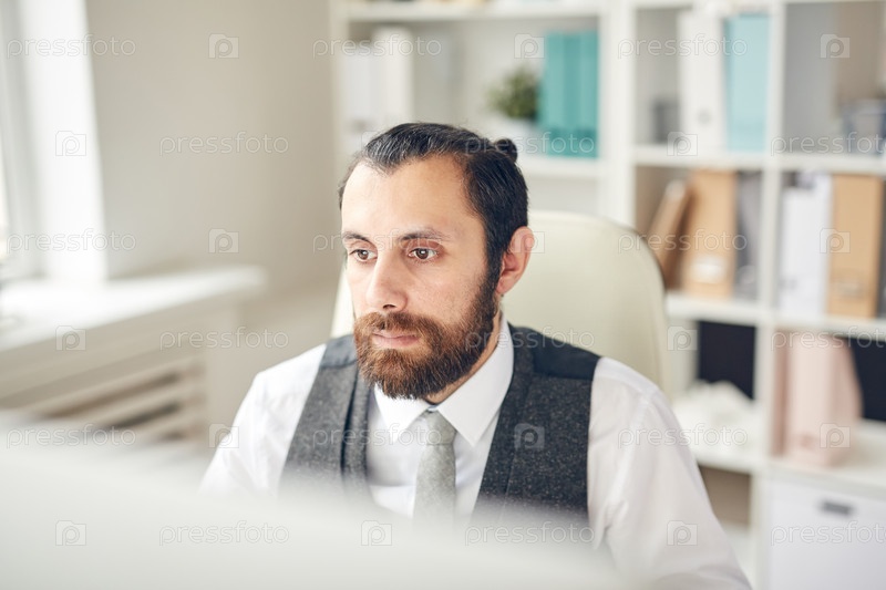 Серьезный молодой бородатый мужчина в жилете сидит перед монитором компьютера и смотрит веб-сайт компании