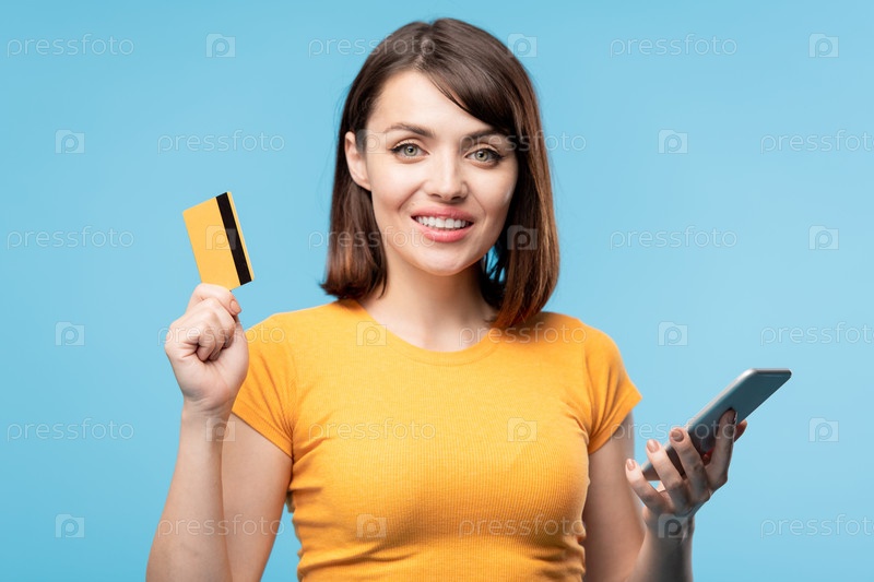 Женщина-клиент показывает банковскую карту, прокручивая промоакции в смартфоне