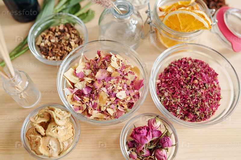 Вид сверху ароматических веществ в мисках на столе, подготовленных для процесса производства мыла