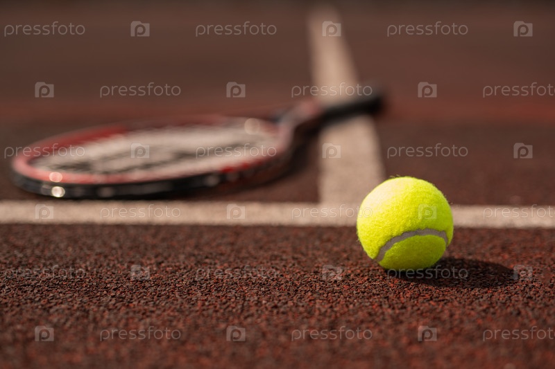 Теннисный мяч на спортивной площадке на стадионе по белой линии